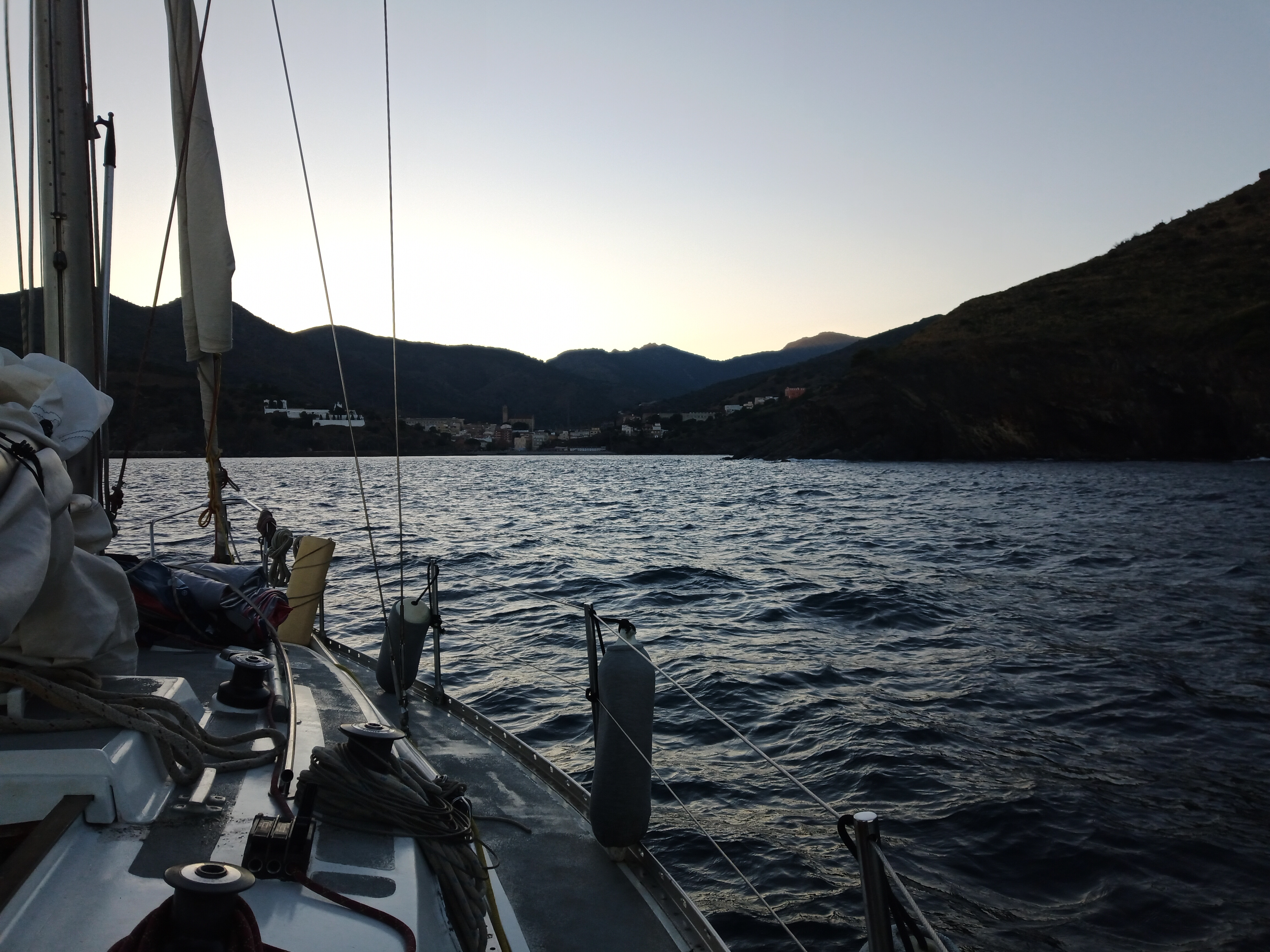 Nous avons pris le large comme prévu le dimanche 7 décembre au matin, comme prévu, le temps annoncé etait très clément avec une moyenne de 5 à 7 noeuds de vent pour une première navigation. Nous nous éloignos progressivement de Sète, il y a finalement moins de vent qur pévu et on décide de suivre la direction de la brise qui gonfle nos voiles. Dans l'après midi le vent cesse, en jargon marin on est en peine "pétolé. On met un peu le moteur et on reprend la direcion du vent. Au matin on est au large des Pyrénéés, le Golf de LIon nous a joué un mauvais tour et on a pas pu prendre le large de toute la nuit, c'est pas grave c'est aussi ca de naviguer au gré du vent... L'après midi la houle se lève car le vent est contraire, la coordination à bord n'est pas la meillure et fin d'après midi nous arrivons à Portbou où nous ferons escale.